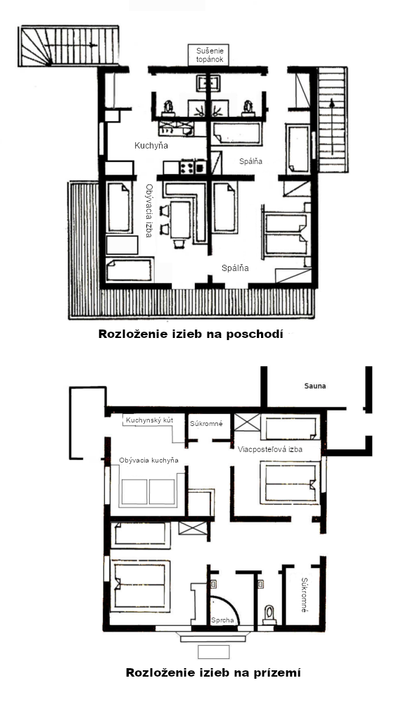 - 1x spálňa s 1x manželskou posteľou a 1x poschodovou posteľou